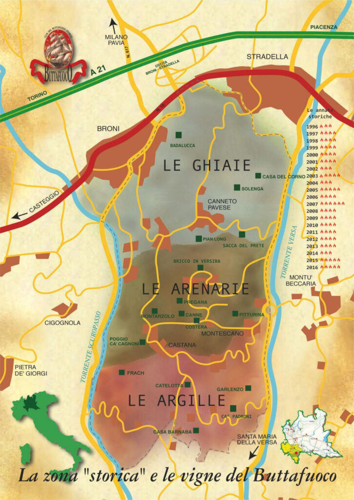 Nei calici saranno versati Buttafuoco della stessa annata prodotti da vigneti nelle tre zone differenti: Ghiaie, suoli formati dal disfacimento di rocce sedimentarie/fluviali, coperti da sedimentazione organica (Nord – Stradella, Broni, Canneto Pavese), Arenarie, suoli composti da arenarie compatte, che garantiscono una forte resistenza alla siccità e producono vini di spiccata mineralità (Zona mediana) e Argille, suoli che contribuiscono alla produzione di vini più rotondi, strutturati e persistenti (Sud).